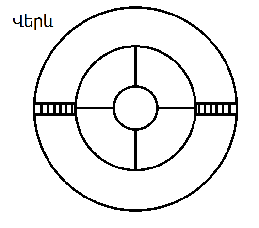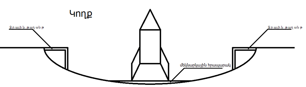 Ոնց տենում եք այս գծագրում մեր գաղութը գտնվում է խառնարանի մեջ: Նա ունի մեկնարկային հրապարկ, որի վրա վայրէջք կարող են կատարել տիզերանավերը և այտեղից էլ մեկնել: Գաղութի կյանքի խցիկները պաշտպանված են ջրային թաղանթով: