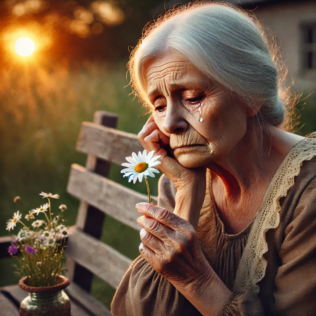 - Нарисуйте иллюстрацию сцены, где бабушка смотрит на ромашку и плачет. Постарайтесь передать атмосферу и эмоции этой сцены.