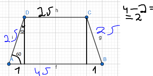 2)Հավասարասրուն սեղանի մեծ հիմքը 4մ է, սրունքը՝ 2մ, իսկ դրանց կազմած անկյունը՝ 60o ։ Գտեք սեղանի փոքր հիմքը։